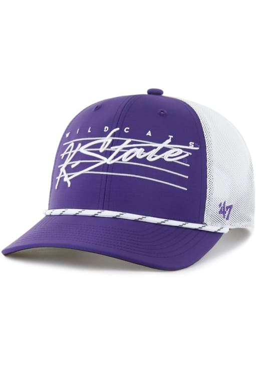 Product Details Product Details 47 Downburst TruckerFront team wordmark with team nickname script and stripingMulti-color ropeContrast meshbackSnap ClosureCOTTON/POLY BLENDCurved BillLow CrownLightly StructuredWipe clean with cloth or cleaning kitImported Officially Licensed This Purple Wildcats Adjustable Hat features a team logo on front.