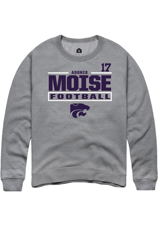 Support your K-State Wildcats and favorite Adonis Moise in this K-State Wildcats Mens Graphite Football NIL Stacked Box Player Crew. This Crew Sweatshirt features a NIL graphic, and is sure to stand out in the stadium. Perfect to wear on game day or any day!