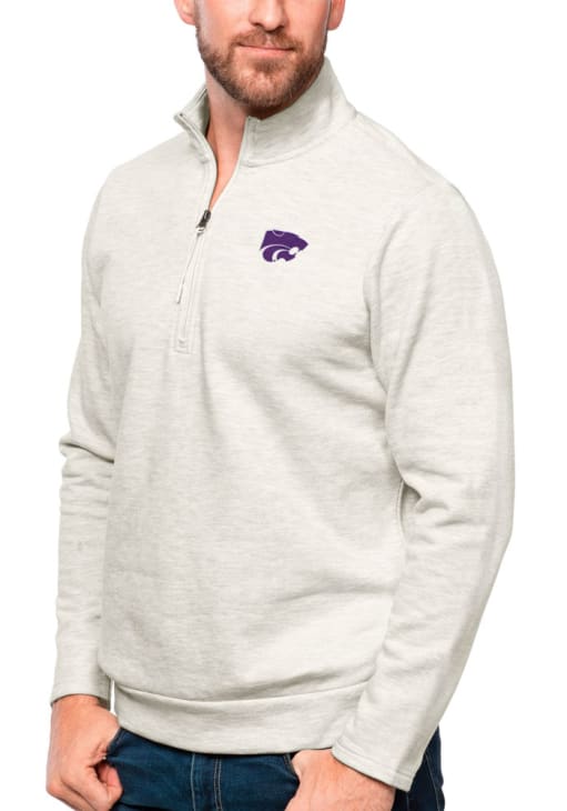 Embrace the warmth and showcase your Wildcats pride with our K-State Wildcats Long Sleeve Qtr Zip Pullover. This Mens Oatmeal Power Cat Gambit Long Sleeve Pullover offers a pique textured heather face with fleece back long sleeve 1/4 zip pullover for the perfect combination of comfort and style. Elevate your everyday look with this must-have K-State Wildcats Long Sleeve Qtr Zip Pullover.