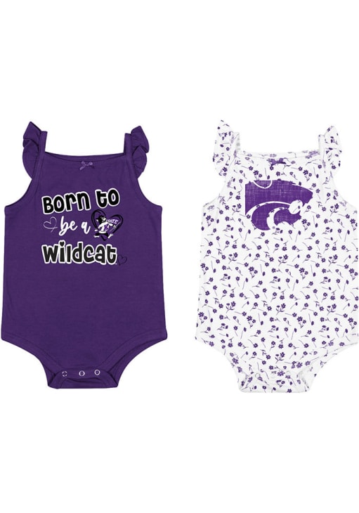 Product Details Product Details ruffle sleevesteam color bow on frontdistressed screen printsnaps on bottonwildflower printImport, Domestic Officially Licensed Your little Wildcats fan will look adorable in this Baby Purple K-State Wildcats Hopper 2pk One Piece! This K-State Wildcats Romper features a screen print center chest.