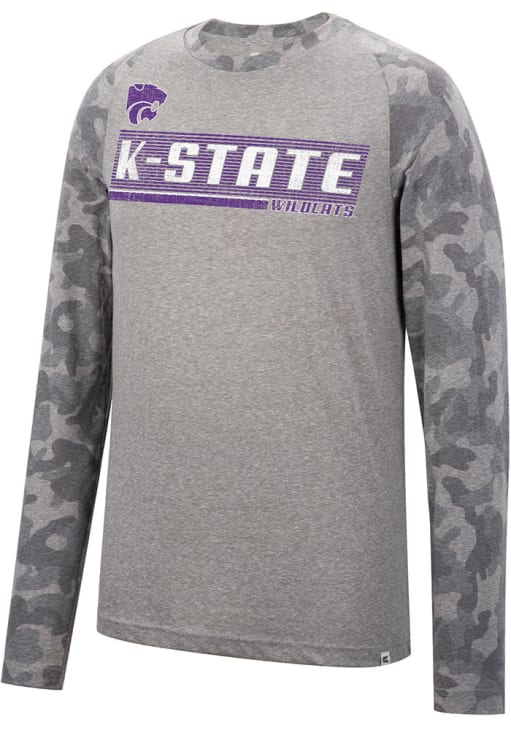 Show your K-State Wildcats spirit in this K-State Wildcats Grey T Shirt! This K-State Wildcats Quintana Camo Raglan Long Sleeve T Shirt makes a great layer for cooler nights cheering on the Wildcats. Featuring a allover camo print with team name on front chest, this K-State Wildcats Long Sleeve Tee is an essential addition for every fan. Fear The Cats!