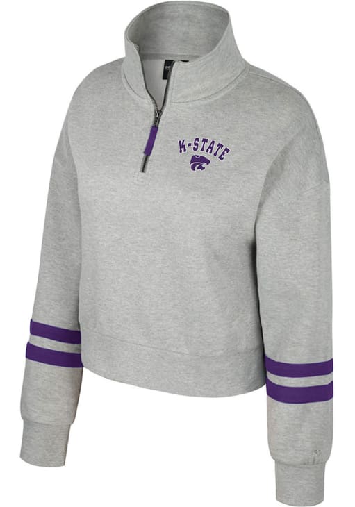 Embrace the warmth and showcase your Wildcats pride with our K-State Wildcats Long Sleeve Qtr Zip. This Womens Grey Sage Long Sleeve Pullover offers a screen print team name and logo on left chest for the perfect combination of comfort and style. Elevate your everyday look with this must-have K-State Wildcats Long Sleeve Qtr Zip.