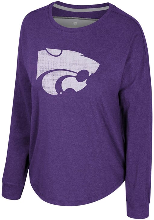 Show your K-State Wildcats spirit in this K-State Wildcats Purple T-Shirt! This K-State Wildcats Lovemore Dolman Long Sleeve T-Shirt makes a great layer for cooler nights cheering on the Wildcats. Featuring a screen print team name and logo on center chest, this K-State Wildcats Long Sleeve LS Tee is an essential addition for every fan. Fear The Cats!