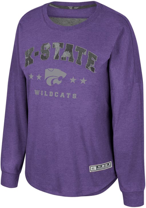Show your K-State Wildcats spirit in this K-State Wildcats Purple T-Shirt! This K-State Wildcats Oorah Dolman Long Sleeve T-Shirt makes a great layer for cooler nights cheering on the Wildcats. Featuring a heather camo applique and washed out print with team name and logo, this K-State Wildcats Long Sleeve LS Tee is an essential addition for every fan. Fear The Cats!
