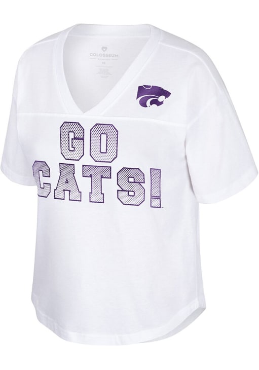 Display your team spirit with this remarkable K-State Wildcats White Shiz Short Sleeve T-Shirt! The K-State Wildcats Short Sleeve Tee showcases a foil print team name and logo at center chest that truly sets it apart. Stand out from the crowd and proudly declare your allegiance to the Wildcats with this exceptional White K-State Wildcats T-Shirt. Fear The Cats!