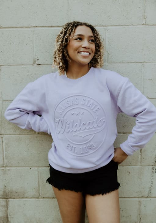 Gear up for the ultimate game day experience with this remarkable K-State WildcatsWomens Lavender Carson Circle Crew Sweatshirt! Designed with the true fan in mind, this Wildcats Long Sleeve Sweatshirt features a embossed school and team name with establishede year on center front. Stay warm and comfortable with this Womens K-State Wildcats Wildcats Crew Sweatshirt.