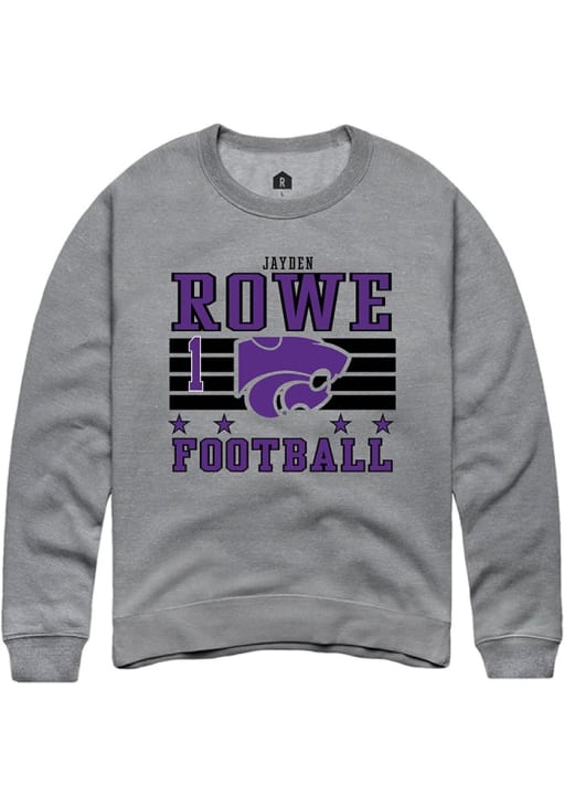 Support your K-State Wildcats and favorite Jayden Rowe in this K-State Wildcats Mens Grey Football NIL Striped Player Crew. This Crew Sweatshirt features a NIL graphic, and is sure to stand out in the stadium. Perfect to wear on game day or any day!