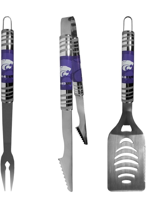 - Grill set includes: spatula with bottle opener and serrated edge, fork and tongs