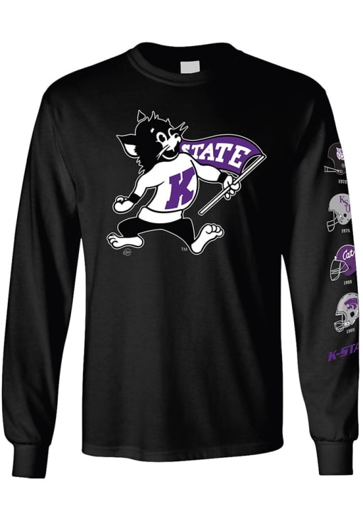 Show your K-State Wildcats spirit in this K-State Wildcats Black T Shirt! This K-State Wildcats Helmets Long Sleeve T Shirt makes a great layer for cooler nights cheering on the Wildcats. Featuring a screen printed Willie the Wildcat on the front with football helmets down the arm, this K-State Wildcats Long Sleeve Tee is an essential addition for every fan. Fear The Cats!