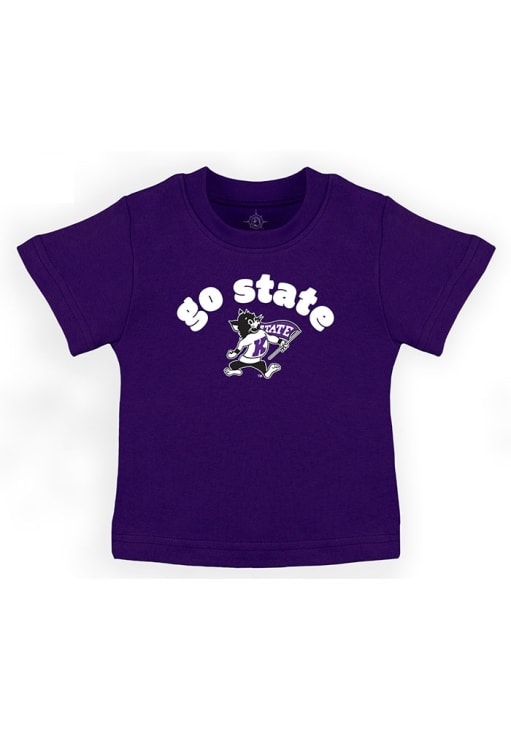 Product Details Product Details Screen print graphic on center chestCrew neckShort sleeveSuper soft fabricationPerfect for all young fans!100% COTTONImport, Domestic Officially Licensed Every future K-State Wildcats fan need a Purple Infant Short Sleeve Tee. This Team Chant T-Shirt features a "Go State" screen print.