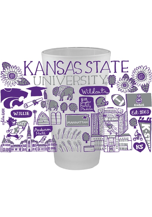 Enjoy a cold one and support your favorite team with this K-State Wildcats Julia Gash 16 oz Frosted Pint Glass. This Pint Glass features a hand drawn illustrations of K-State campus landmarks by Julia Gash. Fear The Cats!