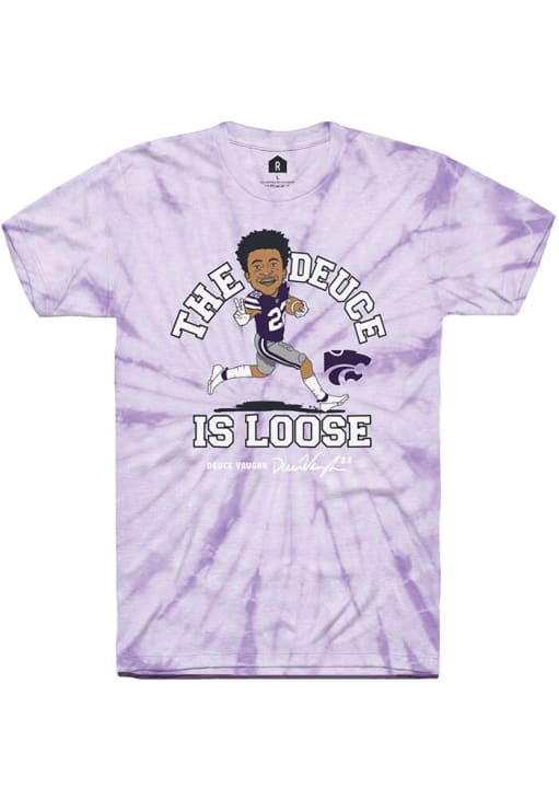There will be no mistaking your K-State Wildcats support when you wear this K-State Wildcats Mens Lavender Caricature Football Tie Dye Short Sleeve! Look great and stand out from the crowd in this K-State Wildcats Fashion Player T Shirt, which features a screen print Deuce Vaughn caricature graphic on front chest.