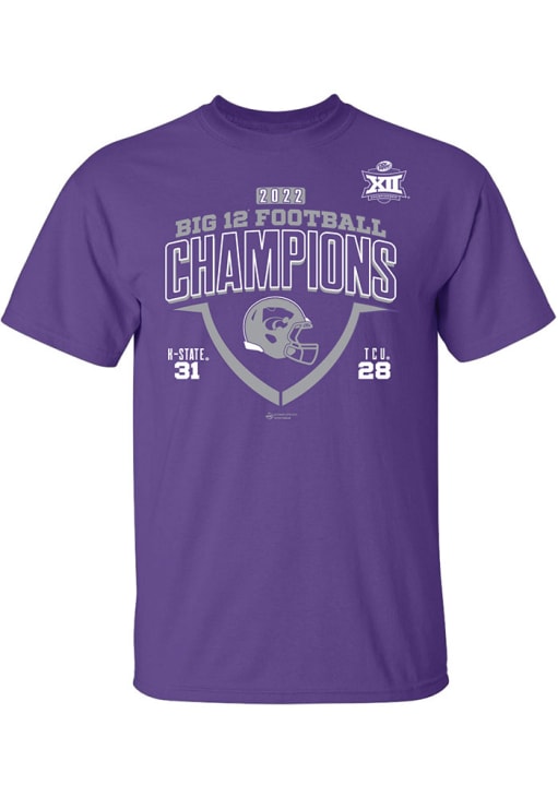 Display your team spirit with this remarkable K-State Wildcats Purple 2022 Big 12 Football Champs Short Sleeve T Shirt! The K-State Wildcats Short Sleeve Tee showcases a screen print Kansas State Football Big 12 Champions graphic on front chest that truly sets it apart. Stand out from the crowd and proudly declare your allegiance to the Wildcats with this exceptional Purple K-State Wildcats T Shirt. Fear The Cats!