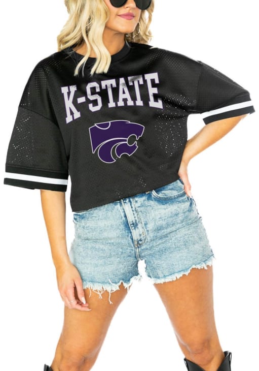 This remarkable K-State Wildcats Womens Game Face Fashion Football Jersey, showcasing a screen print team name and logo on center front. Elevate your admiration for K-State Wildcats as you embrace this exceptional piece, designed to impress.