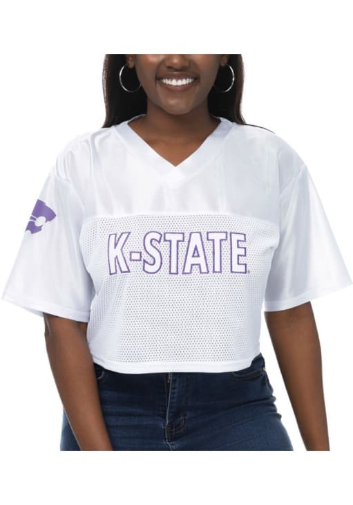 This remarkable K-State Wildcats Womens Sideline Cropped Fashion Football Jersey, showcasing a screenprint team name on center front and team logo on right sleeve. Elevate your admiration for K-State Wildcats as you embrace this exceptional piece, designed to impress.