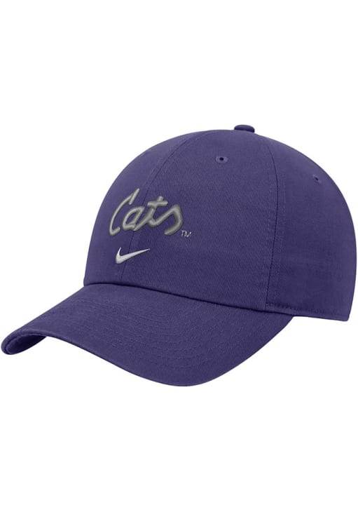 Product Details Product Details Nike - Cotton Club AdjTeam logo on frontTeam color all overNike swoosh on left hand sideAdjustable closureCotton TwillCurved BillHigh CrownLightly StructuredWipe clean with cloth or cleaning kitImported Officially Licensed This Purple Wildcats Adjustable Hat features a front embroidered team logo.