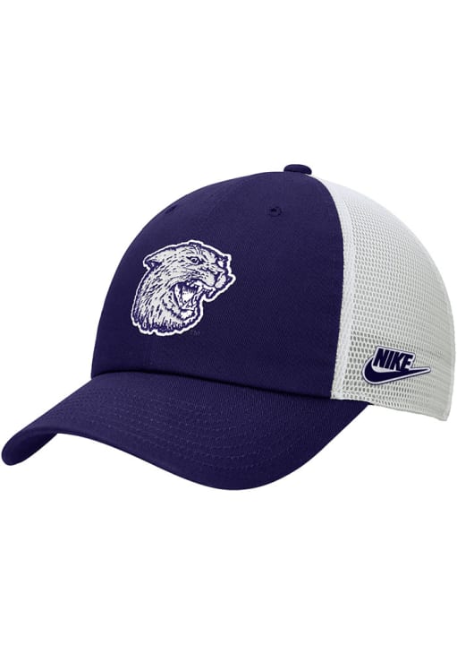 Product Details Product Details Nike - Cotton Club AdjTeam logo on frontTeam color all overNike swoosh on left hand sideAdjustable closureCotton TwillCurved BillHigh CrownLightly StructuredWipe clean with cloth or cleaning kitImported Officially Licensed This Purple Wildcats Adjustable Hat features a front embroidered team logo.