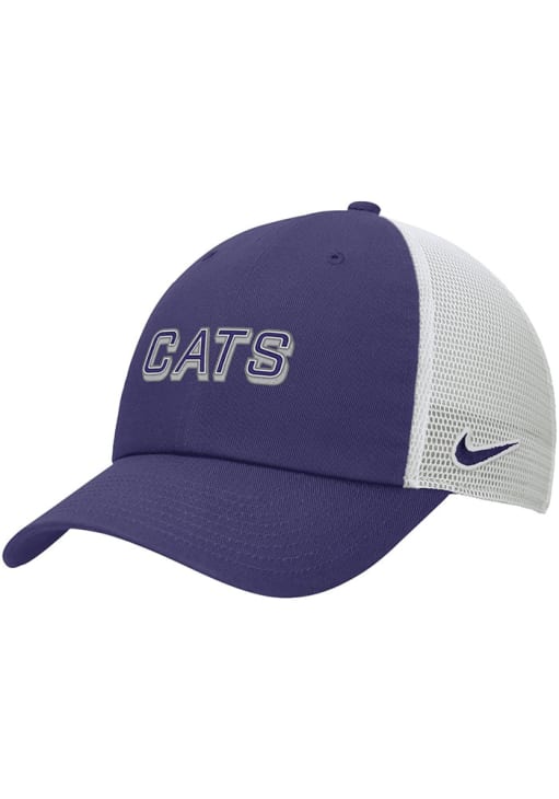 Product Details Product Details Nike - Mesh Back RiseTeam logo on frontMesh backingAdjustable closureNike swoosh on left hand sideCotton Poly BlendCurved BillHigh CrownStructuredWipe clean with cloth or cleaning kitImported Officially Licensed This Purple Wildcats Adjustable Hat features a front embroidered team mascot wordmark.