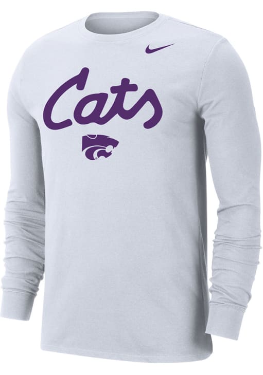 Show your K-State Wildcats spirit in this K-State Wildcats White T Shirt! This K-State Wildcats Dri-FIT Cats Script Long Sleeve T Shirt makes a great layer for cooler nights cheering on the Wildcats. Featuring a screen print of official 2019 Football Special Release logo on front chest, this K-State Wildcats Long Sleeve Tee is an essential addition for every fan. Fear The Cats!