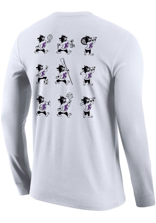 Show your K-State Wildcats spirit in this K-State Wildcats White T Shirt! This K-State Wildcats Varsity Willie 2 Hit Long Sleeve T Shirt makes a great layer for cooler nights cheering on the Wildcats. Featuring a screen print team logo on front left chest with graphic on back, this K-State Wildcats Long Sleeve Tee is an essential addition for every fan. Fear The Cats!