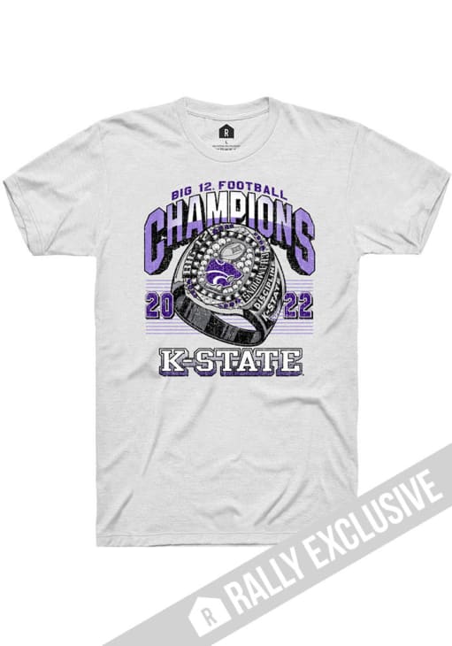 Display your team spirit with this remarkable K-State Wildcats Rally White Big 12 Champion Ring Short Sleeve T Shirt! The K-State Wildcats Short Sleeve Tee showcases a screen print Kansas Wildcats Big 12 Champion Ring graphic on front chest that truly sets it apart. Stand out from the crowd and proudly declare your allegiance to the Wildcats with this exceptional White K-State Wildcats T Shirt. Fear The Cats!