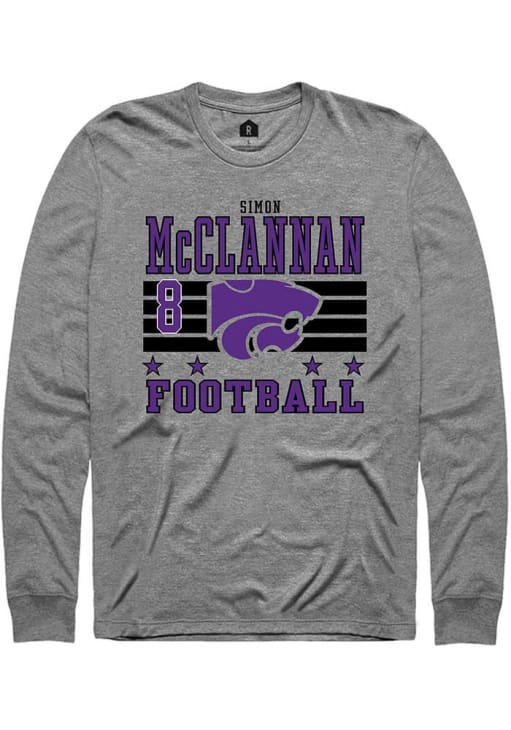 Embrace the spirit of your favorite player in this K-State Wildcats Grey Football NIL Striped Simon McClannan Long Sleeve Player Tee! This Player T Shirt features a NIL graphic, so everyone will know you cheer for K-State Wildcats, Simon McClannan! This is the perfect Wildcats Player Tee for game days. Fear The Cats!