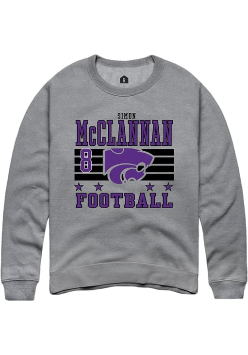Support your K-State Wildcats and favorite Simon McClannan in this K-State Wildcats Mens Grey Football NIL Striped Player Crew. This Crew Sweatshirt features a NIL graphic, and is sure to stand out in the stadium. Perfect to wear on game day or any day!