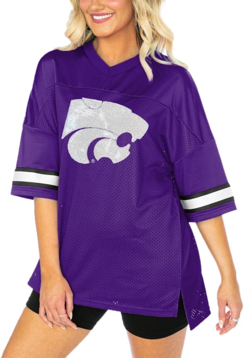 This remarkable K-State Wildcats Womens Rookie Move Oversized Sequins Fashion Football Jersey, showcasing a seqiun applique team logo on center front. Elevate your admiration for K-State Wildcats as you embrace this exceptional piece, designed to impress.